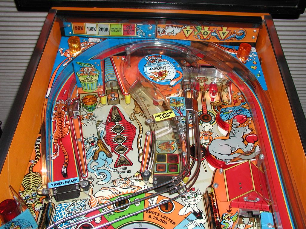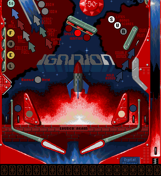 A space-themed table that features a skill shot, bonus hold, and easy opportunities to increase your score multiplier. Fuel your ship and try to make it to Mars...and beyond! The music in this one is appropriately sci-fi-heroic, and the table's red color scheme really works well here. I actually find this one the hardest to get a good score on, because while it's easy to boost your multiplier and get bonus holds, actually getting the points to make them worth it involves some tricky upper-table shots (spell FUEL on the left and then hit the upper-left ramp) and spelling IGNITION with the center drop targets. The skill shot on this table, though, is probably the second-easiest (next to Steel Wheel) if you're handy with the nudge button. That's an easy 2x, right from the start of the ball.