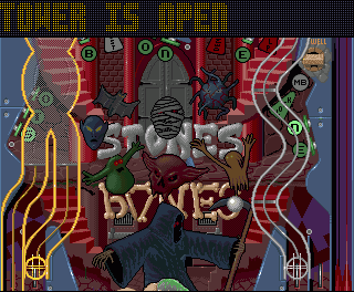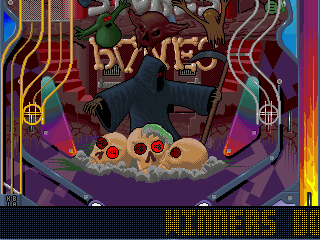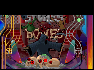 The hardest table here, appropriately enough. Nightmare takes place in a graveyard, and has a steeper slanted table than the other three, which means your ball is going to be much harder to launch up and easier to lose. On the flip side, though, skilled players can earn far more points on this table than the other three, due to its many opportunities for jackpots by hitting the ramps a lot. Nearly every ramp hit on this table will increase the jackpot. I love the music for this table. Strangely, the menu picture calls this table Nightmare, but only the word Graveyard appears on the table itself. This was fixed, however, for GameTek's handheld adaptations.