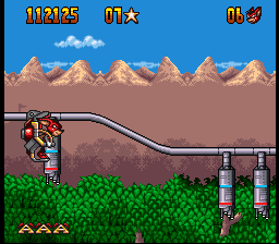 The graphics, while somewhat basic by the standards of 1993, serve well enough. The sprites on the smaller side, which at least usually prevents you from running into things you can’t see too often. While he’s not the most exciting of characters, Aero has a few cute animations like his moonwalking between stages, or the way his eyes bug out when one of the bosses grabs him, that help to give him enough life. The stages, however, are somewhat on the bland side, although they’re at least colorful and distinctive enough on their own. The music is almost overpoweringly loud on either end, but once you get used to it, its bouncy, fairground organ-esque soundtrack fits well with the game’s general theme.