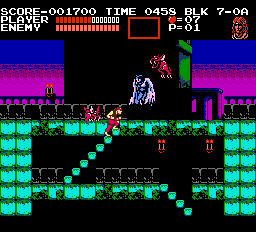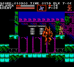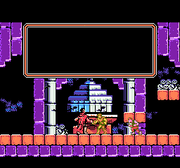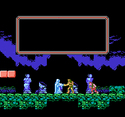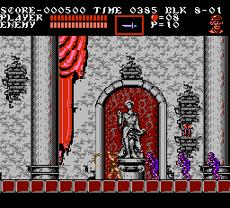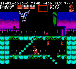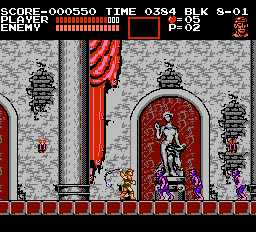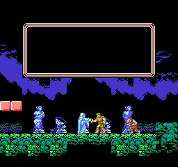 Among the bizarre changes: The lettering used on the menu is different - the Japanese version has the same font in the original, while the NES version uses a more stylized gothic font. Also, the "HELP ME" code does not work in the Japanese version. The cross in the intro sequence is not as detailed (the American is on the left, Japanese on the right.) I don't know if this is for religious reasons or mapper capabilities.) The clouds in the prologue sequence move to the left in the Japanese version - they're entirely static in the American one. There are small changes to the enemy design. The zombies look significantly less human in the NES version. The igor monsters are actually little demonic frogs in the Japanese version. And the Levaiathan Gargoyle is comprised of different colors. Also, the statues in level 8 of the castle are unclothed like SCV4.