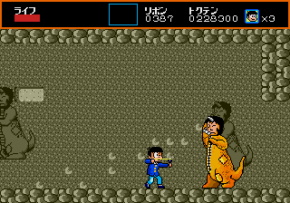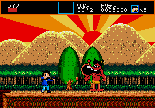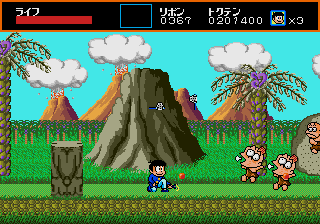 The visuals are striking, particularly the funky backgrounds, and so colorful that it looks more like a Turbografx-16 game. In the third level, which has a prehistoric theme, the cavemen enemies even have a dying pose that makes them look just like Bonk, though this game predates the character’s first game by about a year. The sprites do a good job of reproducing mangaka Fujio Akatsuka’s old-fashioned cartoon style, with Osomatsu’s facial expression even changing depending on how much health he has left, but they aren’t very large, and together with the animations, they give the game a bit of an 8-bit feel. Considering the year of its release, this isn’t much of a surprise.