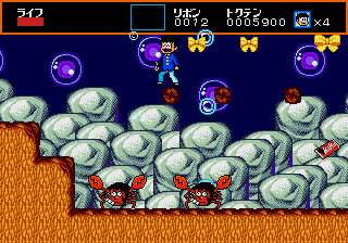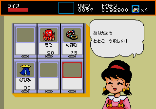 Totoko appears in a few spots as a shopkeeper, the currency in use being ribbons that you collect throughout the game. She sells various items that can then be accessed by pressing Start, such as wings that let you fly for a few seconds and a fish bone that summons a cat for you to ride, but none of them are especially useful. You can also spend your ribbons in a slot machine where you can win extra lives, or a mini-game where you pick a path through a small top-down maze to get Osomatsu to a treasure chest.