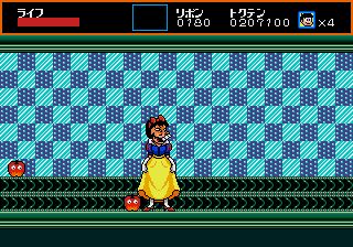 Your first objective is to find and defeat the local mid-boss, after which a new path opens up that takes you to the true stage boss. Both regular enemies and mid-bosses are usually variations of Iyami, Chibata, Dekapan, or other cast members, repurposed as man/animal hybrids and bizarre creatures, while the three major boss battles have Iyami throwing projectiles in simple patterns under some goofy disguise. In the second level, he’s dressed as Snow White.