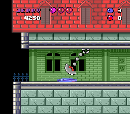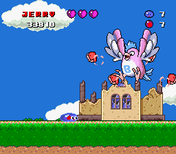 Playing as a slime ball brings a few spins to the platforming mix. Since Jerry has no limbs, he has to find other means of offense. He can stretch up or squished down around or on enemies to knock them away, or fling balls or other power ups he collects and stores in his jelly mass. His slurping goo form can also climb walls and on ceilings or slip through pipes to traverse levels or save his slimy bacon from plummeting into a pit. He can collect items in flowers throughout the levels, gathering multiple balls as ammo, a steel ball that weighs Jerry down but can be flung over and over again, a hi-jump booster, or a seed he can plant for a beanstalk to climb. Each stage has posts that spell out J-E-R-R-Y, which grant two extra lives to Jerry Bean if he touches them all and serve as checkpoints.