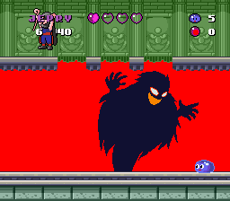 Much like the Mario series, the kingdom seems to stretch a myriad of biospheres. The game leads through many stock level themes with a beginning grassland leading to an urban area, desert palace, the aformentioned moon, the arctic, a beach, a dark castle, and more. In between each stage is a city, town, or village to head through, chatting with townsfolk and earning 1ups from the helpful but mysterious elderly mentor watching out for the cursed prince. The populated locales do spread to strange areas like a mountain villa, a collection of igloos, a cloudy heavens inhabited by angels, even a few people living inside the belly of a whale. They serve as breathers with plenty of tips, flavor text, and free extra men– er, slimes. The Magician’s controlled army are quite cutesy, with walking mice and googly-eyed boulders, living flames, penguins patrolling the landscape en masse. A few out-there foes stand guard, like unfrozen cavemen, naked fire-breathers, spatula-throwing chefs, to even a constellation as a boss.