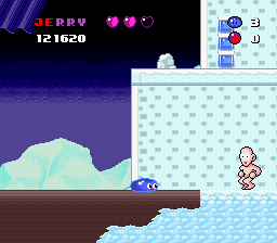 As an early SNES title, it isn’t far removed from the platforming faire of the NES days. The blue slimeball Jerry heads left to right using the standard 2-button attack/run and jump methods perfected with Super Mario Bros. years before. Aside from the music and sound effects, there is little push to take much advantage of the 16-bit system, lacking transparency effects for the underwater segments. The only real attempt to showcase the new console’s visual capabilities was the Mode 7 scrolling on the moon, though many first gen SNES games abused that built-in graphic setting. Luckily, a certain level of charm in the blocky build of the colorful sprites holds up today better than during its debut.