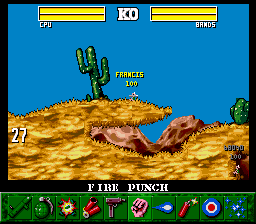 Bazookas and grenades aren’t all you’re limited to, however, as there’s an assortment of different weapons to master, each with their own particular uses. The shotgun has a short range, but lets you get in two attacks per turn, potentially offing two opponents in the right circumstances. The “Fire Punch” and “Dragon Ball” are most flagrant violations of Capcom’s copyright, but are useful for knocking opponents in a vertical arc or straight horizontally, respectively, potentially putting enemies right where you want them. The blowtorch and drill aren’t quite as damaging as more conventional weaponry, but are custom made for burrowing forwards and downwards to relative safety. Perhaps most powerful of all is the mighty airstrike, which can be used once per round to slam a small horizontal area with bombs – perfect for ruining tightly packed groups of worms.