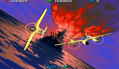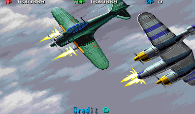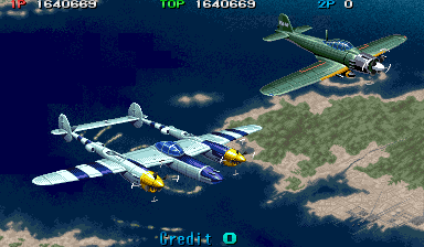 1944 also has some mighty impressive graphical effects. When your plane explodes, a little pilot ejects and activiates his parachute. If you put another credit in, you control another ship, which swoops into play. If can catch the pilot, you get rewarded with bonus points, bombs, and shot upgrades.