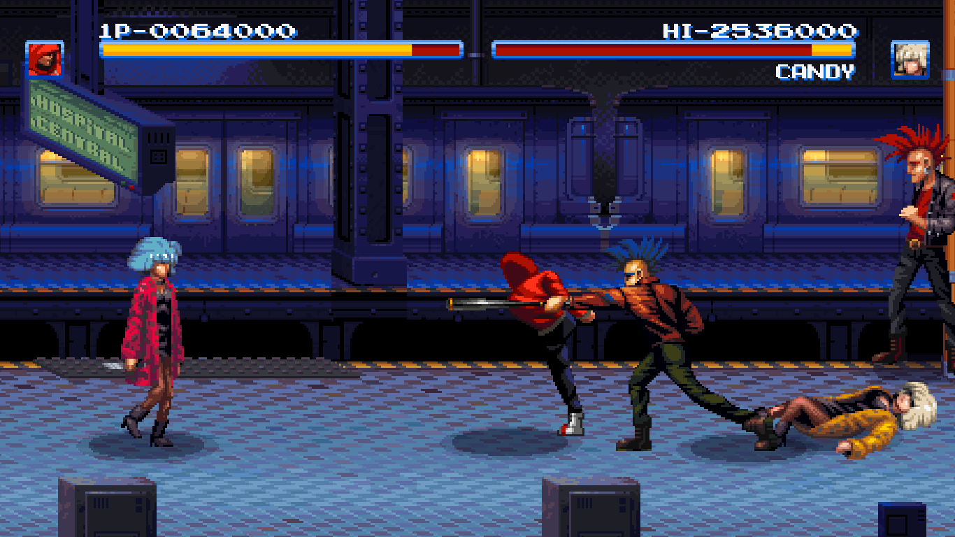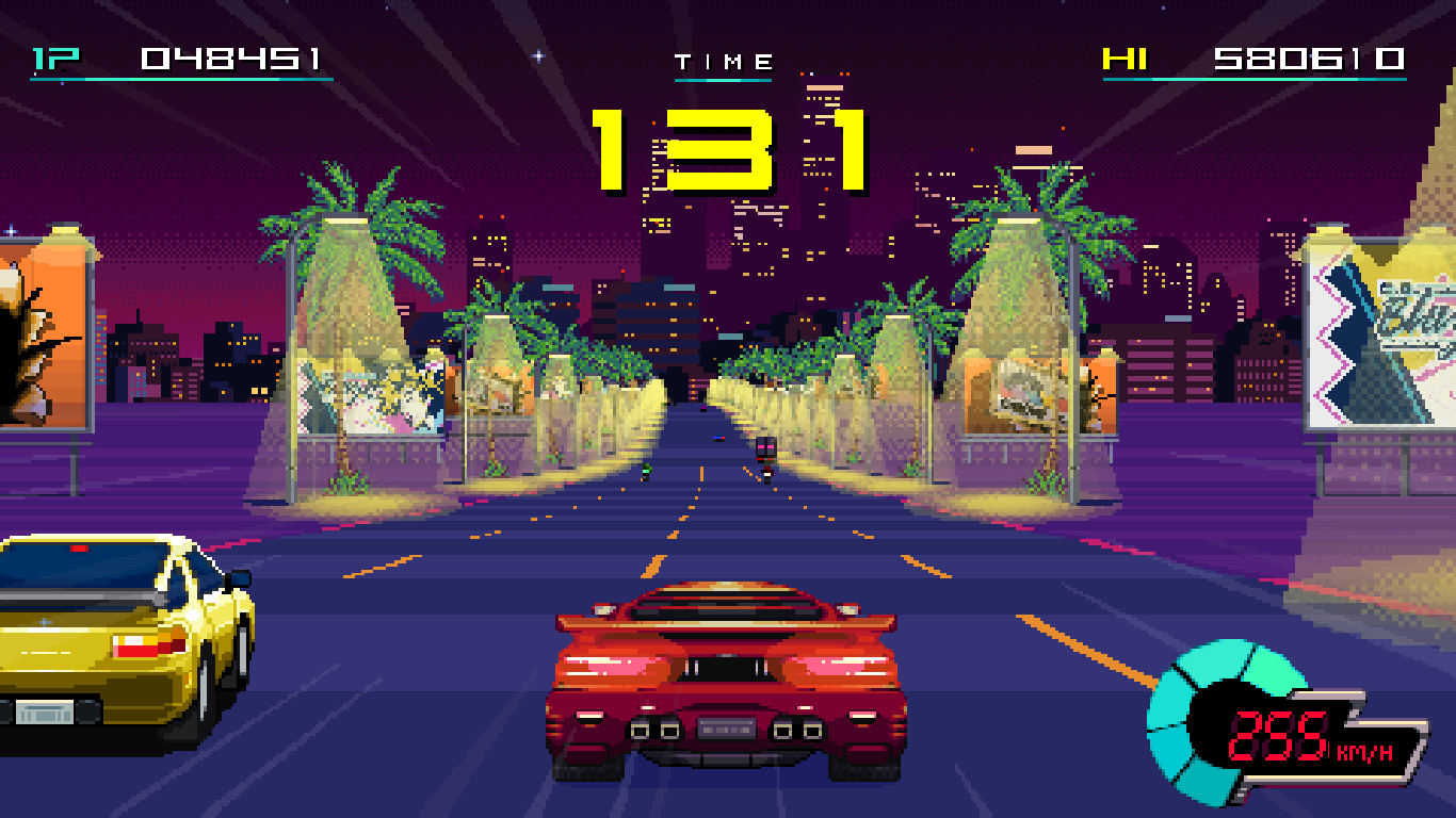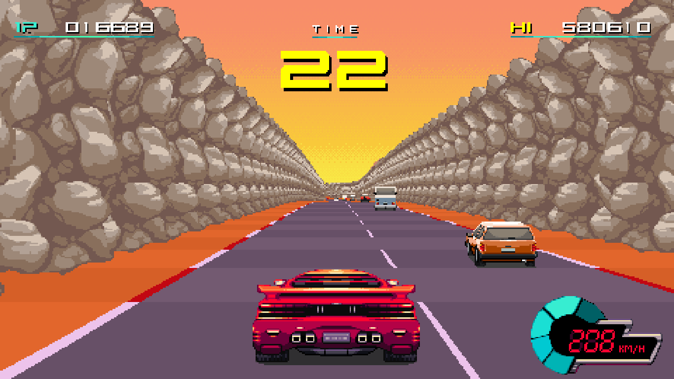 It’s still an admirable attempt, and it succeeds more than it stumbles. The arcade games themselves fare much better, with five different ones covering different popular genres. The last two games cheat a bit, though, being an auto-runner and an RPG. Those weren’t exactly popular genres in the 80s arcade scene, though they at least manage to be fun in themselves and look the part. The first three do fit the theme better, starting right off with a beat-em-up, moving to a shoot-em-up, and breaking things up with an Outrun style driving game. They also slowly build in difficulty, with the fourth game being the hardest overall as the fifth acts as a mechanical breather to let the story take center stage.