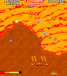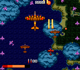 Every so often, a large group of red-colored enemies will fly in formation and taunt you. If you can shoot down all of these planes, you receive extra points, and either a firepower upgrade or options. The firepower upgrade is pretty weak and hardly essential. The options on the other hand, put two smaller planes that fly next to you and fire when you fire, effectively tripling your firepower. The downside is that they can be destroyed if an enemy shoots, or more likely, rams them.