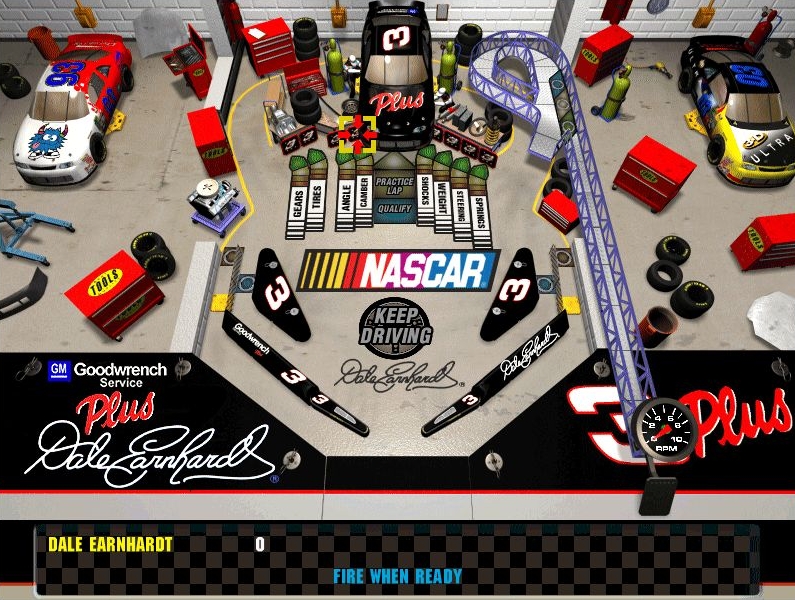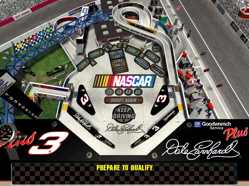 NASCAR Pinball borrows the engine from Thrill Ride, so the game now runs at a higher color depth and a resolution of 800×600. It looks much cleaner than the previous few games, and the depth of color helps make the tables look more like the real locations they’re supposed to represent.