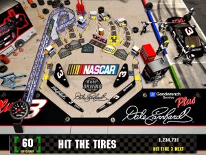Amazingly enough, NASCAR lends itself quite well to the world of pinball, with the various drop targets and bumpers being replaced with piles of tires, tool boxes, garage jacks, and track walls. Your pit crew will talk to you on the radio as you play, telling you about where your ball should go next, as well as teasing the player if they bump the table too much (“Take it easy, it’s only pinball!”). Since the tables are actual locations at a NASCAR track (the garage and the track itself), table bumping becomes a bit absurd, since you’re essentially bumping an entire mass of land instead of a mere table.