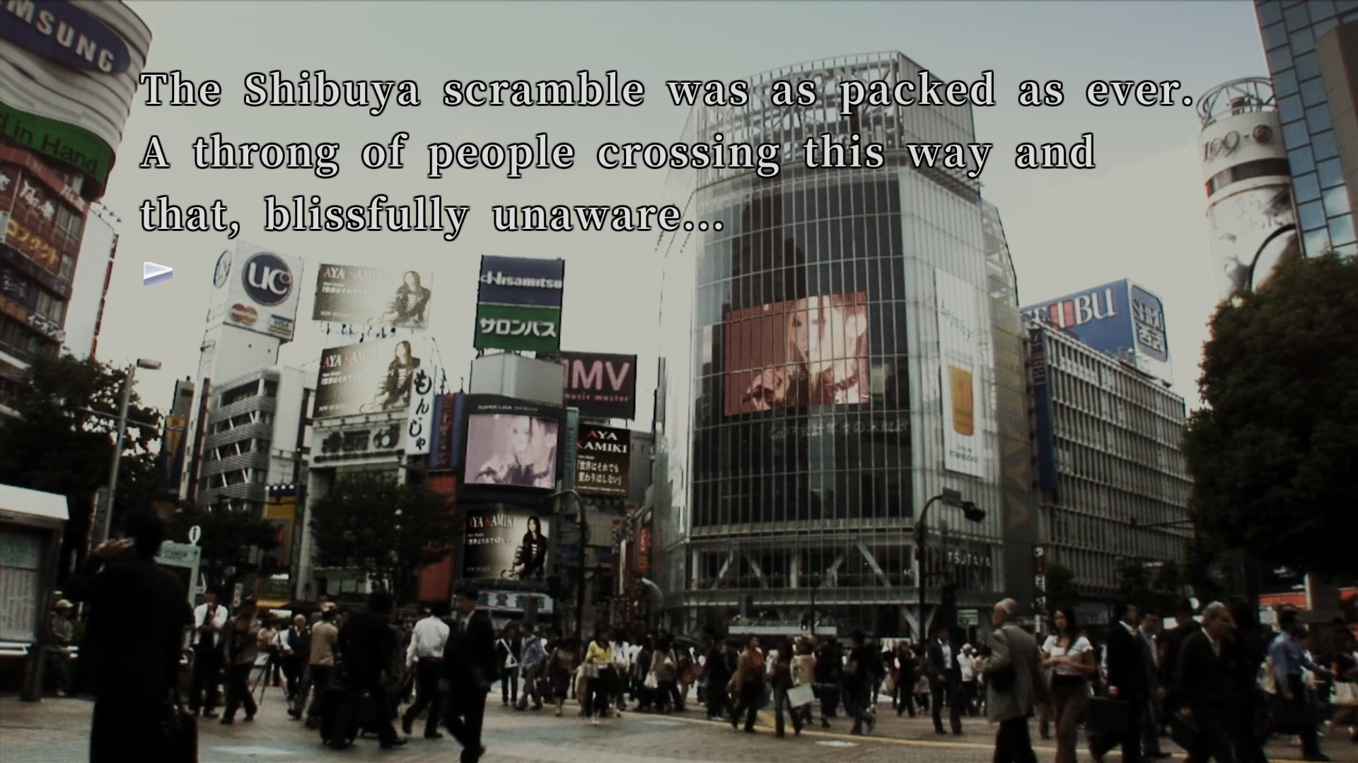 This basic style was then used for the 1998 Saturn/PS1 game Machi: Unmei no Kousaten (“City: The Intersection of Fate”), though now featuring stills of digitized actors. This game was then followed up in 2009 by 428: Fuusasareta Shibuya de (“In a Blockaded Shibuya”), initially released for the Wii and then ported elsewhere. These later two titles were beloved by Japanese fans, with Machi being voted the 5th best game of all time in a 2006 reader voting poll by Famitsu Magazine, and 428 earning the coveted perfect 40/40 score from the same publication.