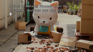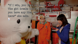 A mysterious girl stuck in a mascot cat suit, she ends up taking a temp job at a presentation to sell a shifty diet drink called Burning Hammer. Hers is the only of the main chapters told in the first person.