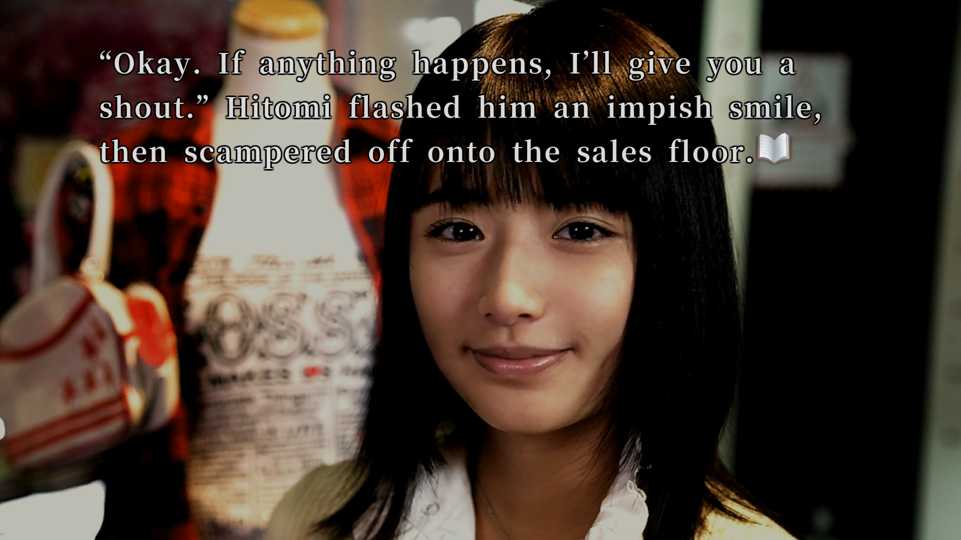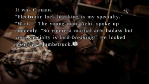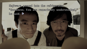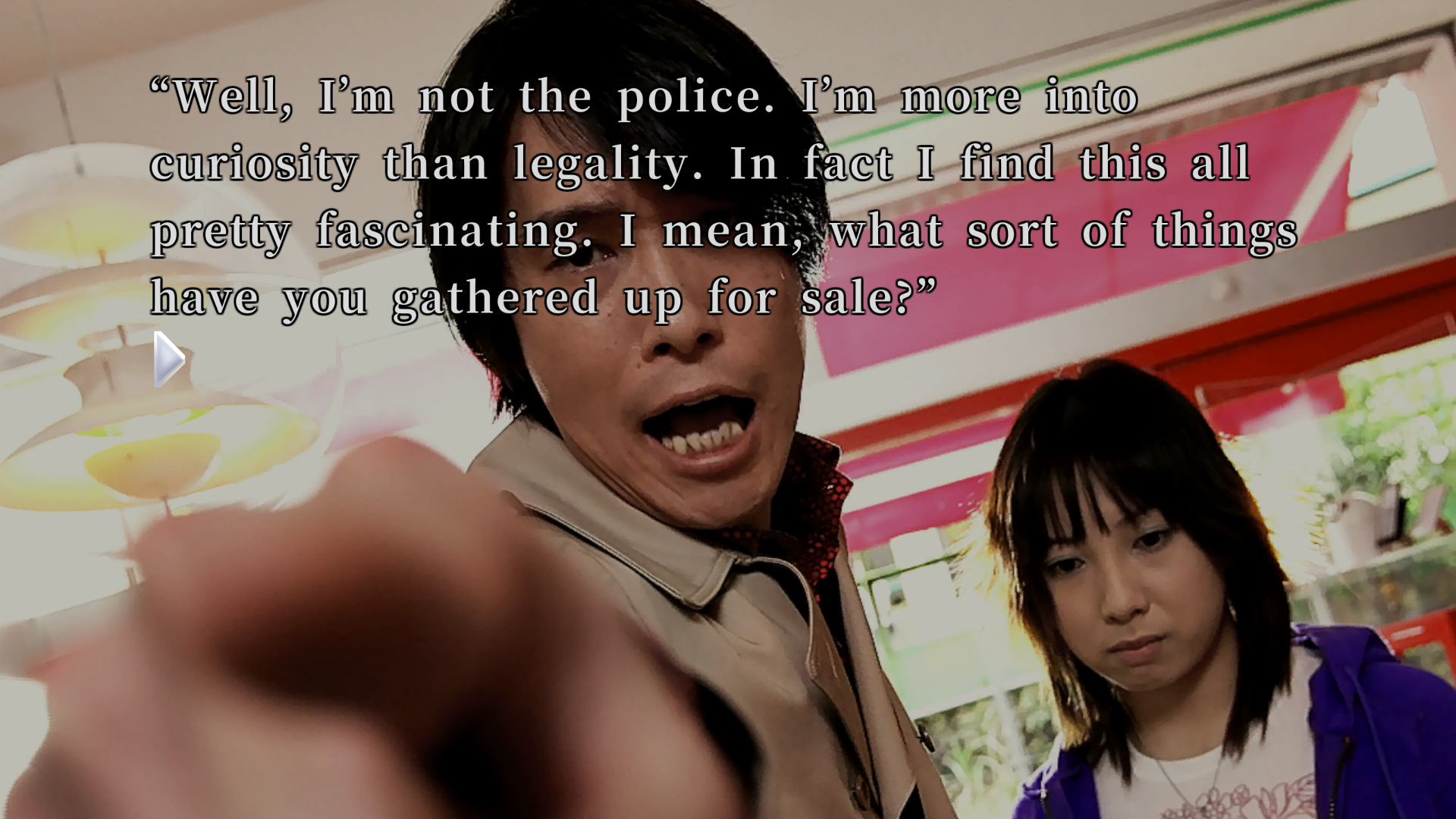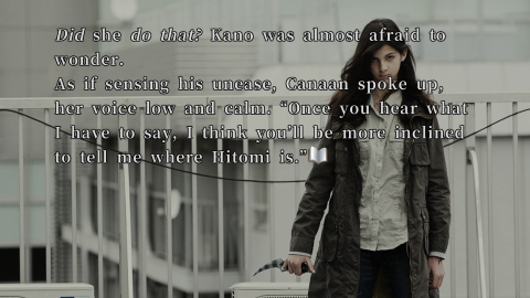 Tama’s initially seems more divorced from the main story, and by far the silliest, especially when dealing with their boss, the perpetually unlucky business man Yanagishita, whose actor pulls off a stunning amount of physical comedy despite (mostly) being limited to still pictures. There are a few parts where the story gets a little too goofy or incredulous – the super powerful adolescent assassin girl Canaan strains credibility, even in a scenario involving deadly viruses, CIA agents, and international terrorists. Plus it features cameos by real life pop star Aya Kamiki, whose song “Sekai wa Sore Demo Kawari wa Shinai” routinely appears in the game. Though to players who aren’t familiar with Japanese pop, she may as well be a fictional character anyway, so her presence won’t feel quite as cheesy.
