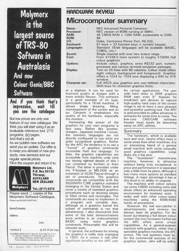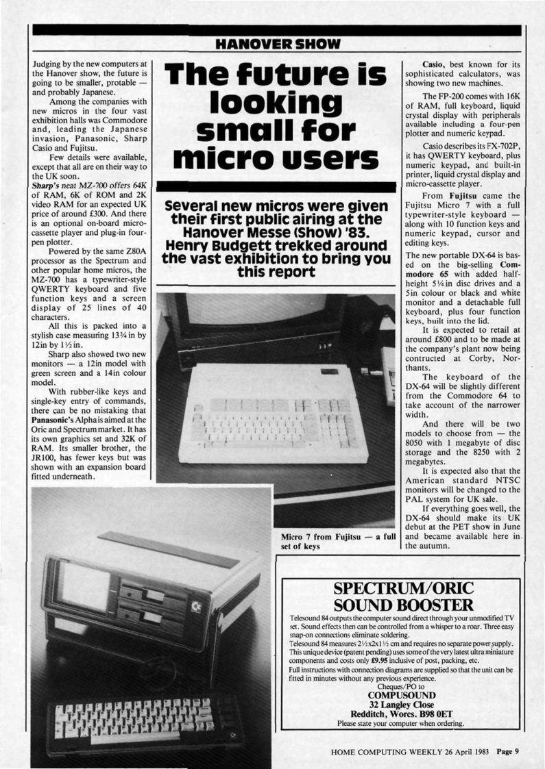 Nevertheless, most Japanese computer makers did attempt to sell their hardware overseas. NEC had a subsidiary company based in Boston, and presented various computers at American electronics shows in the early 1980s, such as the PC-6001 (rebranded the NEC Trek), the PC-8001, and the PC-9801 (rebranded the NEC APC). In Europe, computers from Panasonic, Sharp, Casio, and Fujitsu were debuted at the 1983 Hanover Messe, and Sharp's MZ series attracted a loyal following. The NEC APC (PC-9801) was even voted the Australian personal computer of the year for 1983. In general, Japanese computers received glowing reviews, as seen in this review of the NEC APC (1, 2, 3, 4), and this review of the NEC APC III (1, 2, 3), both published in a New Zealand computing magazine. Unfortunately, third-party support was a problem, and only a few Western software companies (such as Magicsoft) actively supported Japanese systems. Sales were sluggish, and these early computers were eventually forgotten.