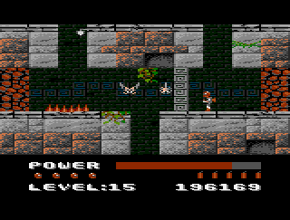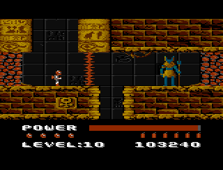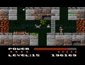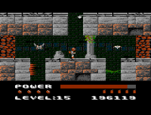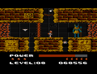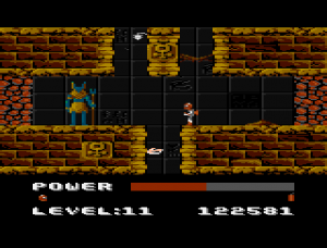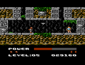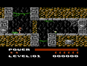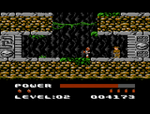 The ruins are littered with bones that may or may not be from previous members of the Archaeology Rescue Team International. Whether they are or not, they do serve as a grim reminder that this is a deadly mission that you’ve undertaken. There are all sorts of creatures infesting the ruins, some of which are bats, spiders, snakes and insects. A quick shot from the laser takes those out, if they don’t get you first. Some of the walls are red-hot, being made of lava, and are deadly to the touch. There are also underground rivers you have to avoid, as the “A” suit wasn’t made to operate underwater. Small electric lamps dot the walls of the ruins, and if you happen to shoot or pass through one, it will go out, leaving the majority of the room in darkness. You can lay down a stick of dynamite if you need to get your bearings, but those only light the rooms for the duration of the blast.