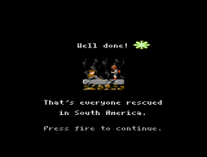 It’s very easy to tell what country you’re in, thanks to the beautifully detailed graphics. Jungle plants creep through the ruins of South America, hieroglyphics dot the walls of the Egyptian ruins, and classic Greek architecture defines the look of the Greek ruins. Other touches, such as the statues of Anubis in the Egyptian ruins, add to the look of A.R.T.I. One particularly nice touch is that some of the adventurers and explorers you must rescue are some of the most famous heroes from adventure videogames and films. During the game, appropriate themes play in each of the ruins, thanks to the implementation of Atari’s POKEY chip for enhanced sound. After the last explorer is rescued, you’re treated to an ending sequence in which Arty congratulates you on a successful mission and gives you your final score.