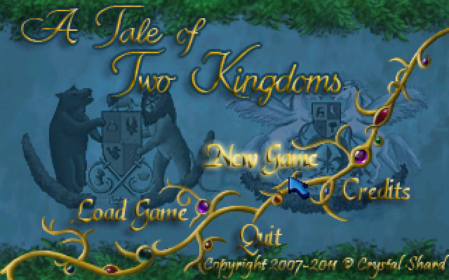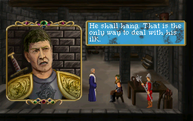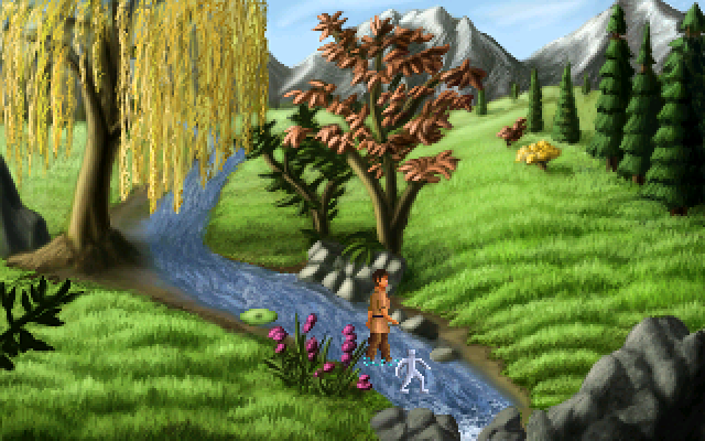 While it contains elements from Celtic myths, A Tale of Two Kingdoms is first and foremost a love letter to Sierra’s King’s Quest series, a medieval fantasy tale with many of the ingredients of the genre: the aforementioned goblins, an evil wizard, a good druid, a dumb giant, and so on. The classic Sierra interface is also there: a bar to select actions, inventory and options appears when the cursor is dragged to the upper border of the screen, and actions can also be cycled with the right mouse button. There’s not one, but two different scores, Wisdom and Honor, and some bad actions can cause the latter to decrease. During conversations, characters can be asked to perform actions, like observing objects or giving them to Maeldun. The hero is not afraid of water: he can cross rivers and ponds, and swim in the sea.