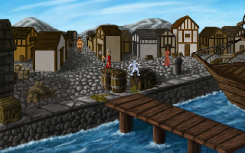 While it contains elements from Celtic myths, A Tale of Two Kingdoms is first and foremost a love letter to Sierra’s King’s Quest series, a medieval fantasy tale with many of the ingredients of the genre: the aforementioned goblins, an evil wizard, a good druid, a dumb giant, and so on. The classic Sierra interface is also there: a bar to select actions, inventory and options appears when the cursor is dragged to the upper border of the screen, and actions can also be cycled with the right mouse button. There’s not one, but two different scores, Wisdom and Honor, and some bad actions can cause the latter to decrease. During conversations, characters can be asked to perform actions, like observing objects or giving them to Maeldun. The hero is not afraid of water: he can cross rivers and ponds, and swim in the sea.