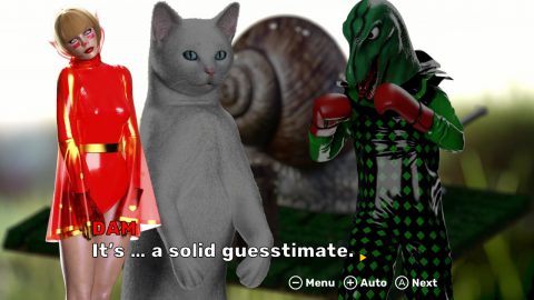 About An Elf is about an elf named Dam, a (possibly self-proclaimed) princess on a quest to rid the land of monsters and create a peaceful elftopia for everyone, aided by her protégé Roland the BraveCat (yes, his name’s written like that). Or so she tells us anyway, as the game actually plays out through an overly elaborate yarn she’s spinning to the (mostly) disinterested elf Dido; one that may or may not be true depending on the moment.