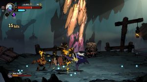 That’s not the game ever feels too easy; even while you’re juggling enemies up and down the screen, there’s almost always some other enemy you have to keep an eye out for, ready to interrupt you. Even the environment often works against you, featuring pits that will take you as quickly as an enemy, or falling rocks to avoid. The enemies themselves are well varied in their approaches and attack patterns, each one still feeling distinct in their own way. Ranged attackers mix with fodder that attack quickly, soon joined by mages and berserkers that can armor through your hits. Rarely, they’ll even perform a juggle on you themselves, although such combos are rare enough that you’ll never feel their attacks are inescapable.
