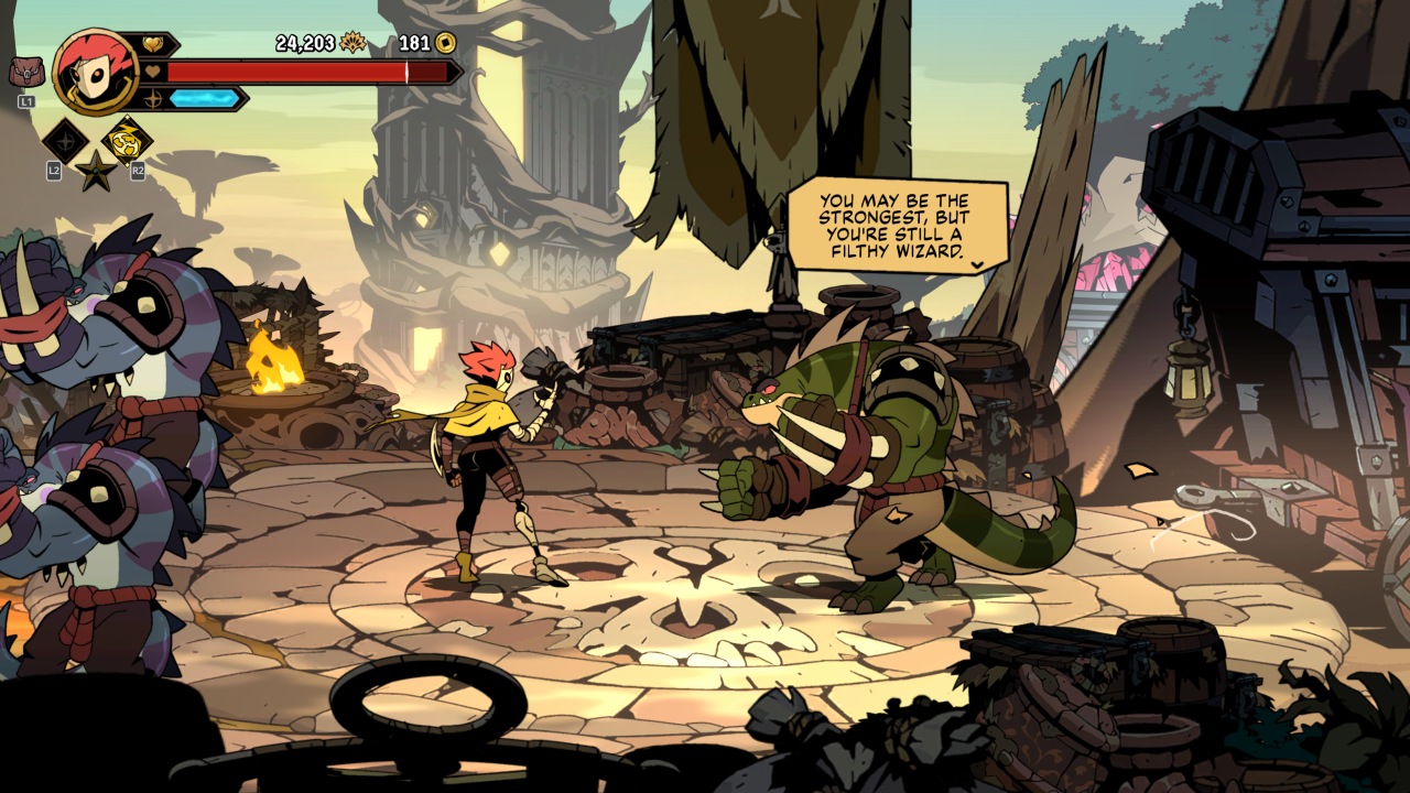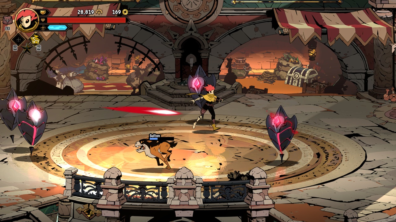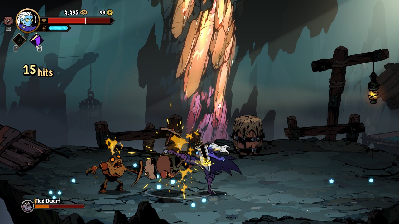 Harkening back to the game’s particular inspirations are throwable weapons that can be collected and thrown at will, interrupting attacks and dealing respectable damage at range. Further inspiration can be seen in the various mounts you’ll occasionally find, offering their own powerful attacks and generally serving as the replacement for more traditional weapon pickups. Your biggest damage dealers will often be your ‘arcana’, a secondary special attack that costs a chunk of a gradually regenerating mana bar. These vary greatly in their utility, ranging from upwards sword slashes, to long-range magical beams, to summoning a clockwork puppet to draw away enemy aggro. Finally, rarest of all are ‘ultimates’ that can deal huge damage, but with only a handful to be found and used per run.