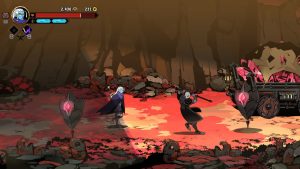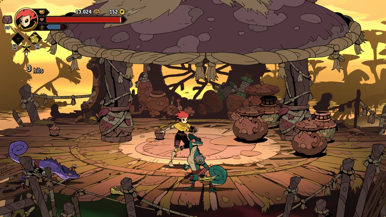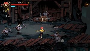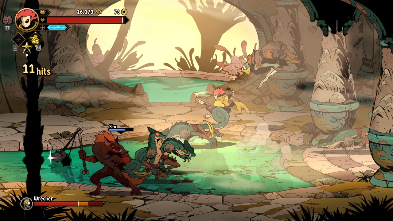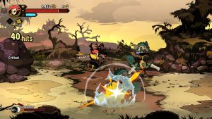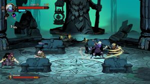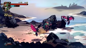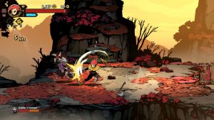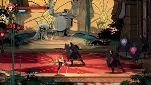 The roguelite elements meld nicely with the beat-em-up core, providing a lot of ways on how you want to approach your build. Clearing an area of enemies gives one of a variety of awards, often currencies to be spent either during or between runs. Rituals of different elements can be bound to different attacks, with each element enhancing your attacks in a particular way. Every so often the gold you’ll find can be put towards items in a shop, enhancing your stats or offering buffs under the right conditions. Perhaps most valuable of all are Inspirations, character-specific enhancements like a divekick, or being able to deal far more damage from behind.