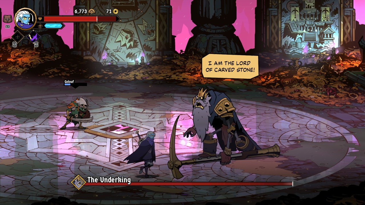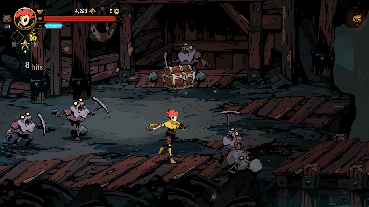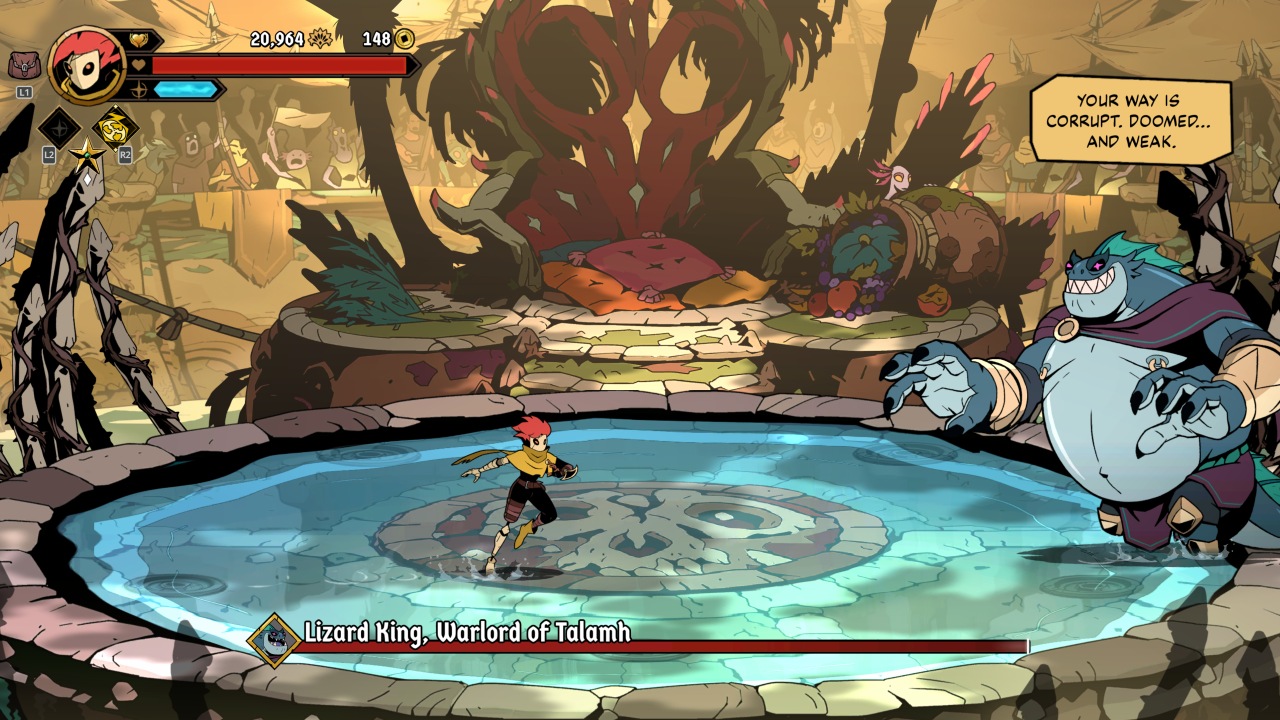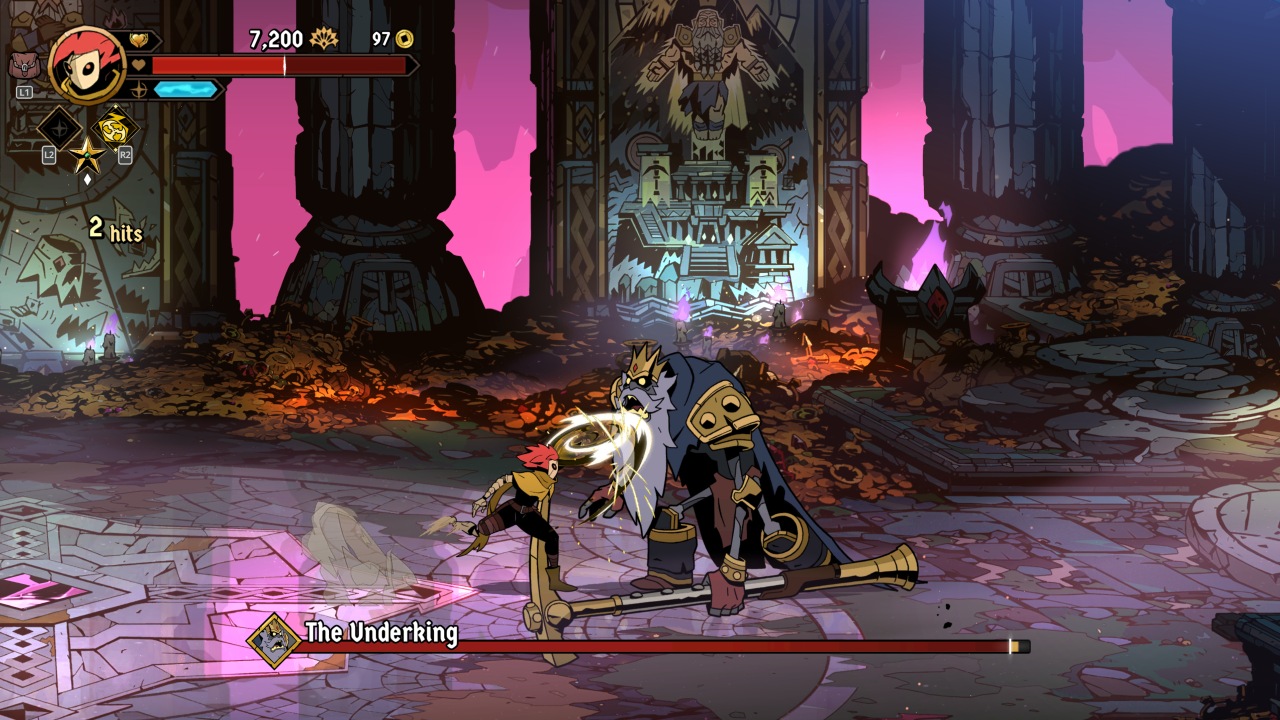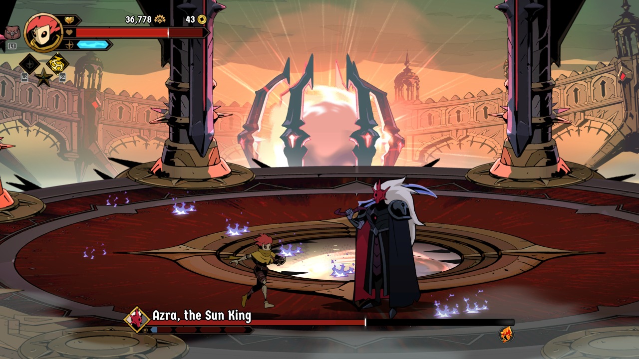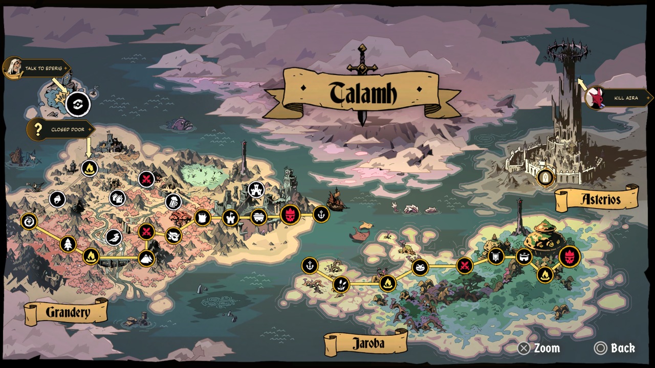 Bosses prove to be where your first major roadblock will be. With varied attack patterns and the ability to armor your way through attacks, more than a few of your runs will end to them. This is where mastery of the clash and deflection mechanics can prove extremely helpful, once you’ve learned how they fight. The endgame in particular proves to be especially fiendish, from a very tough fight with Azra, followed immediately with the game’s true final boss. This fight kicks off by stealing one of your precious revives, and should you not have one, the fight and your run end in immediate failure.