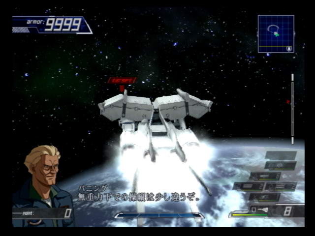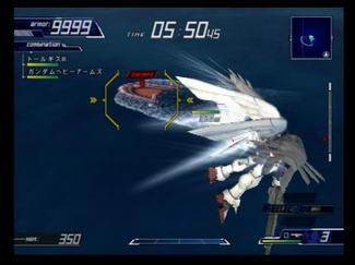 ACE2 is not perfect, however. Despite having a whooping 72 missions, about eighty percent of them fall under the same repetitious mold. There are far too many missions where escorting and protecting a ship is either a primary or secondary objective, and this is a recipe for frustration because several secret objectives require keeping your ship's health above a certain level or getting it to a destination under a time limit. It's one thing to run out of ideas but it wouldn't have killed Banpresto and From Software to reuse some of the more interesting missions from the first game. Another sore point is that From Software hasn't addressed the issue of figuring out your headings in space missions. It doesn't actually detract from the gameplay, since most of the time you're automatically propelled in the direction of your target or have a big 3D arrow pointing towards the objective. However, there were a couple of secret objectives in the first game that required finding a target at the edge of the map and destroying it before it disappears. This was mostly a minor annoyance, but it's pretty glaring in ACE2. In one mission, for example, the secret objective is to destroy several unmarked ships on the map with no clue where to find them except a static 3D map in the pause menu, which has no interest in telling you which direction you're facing. It's bad enough when you're trying to squint your eyes against the bland space backgrounds, but that particular stage's background is very busy. The soundtrack also takes a bit of a dip because the opening tracks of some of the shows don't really lend themselves well to exciting battle themes. While this is really a matter of preference, I have to question decisions like using a somewhat calm piano and violin piece like "White Reflection" as Endless Waltz's theme while omitting the faster tempoed and far more appropriate "Last Impression".