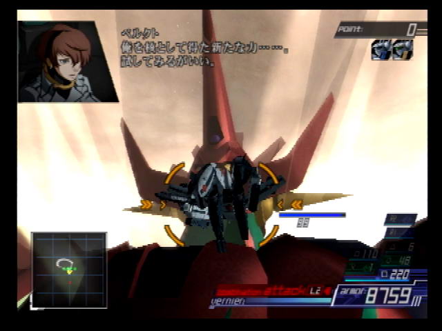 With one exception, there are no longer units restricted to Earth or space missions. Burrowing from the Super Robot Wars Alpha series' squad system, certain mecha now have innate abilities that can affect both you and your wingmen, such as increased defense and gradual healing. The extended melee combos from the second game have been ditched in favor of the simpler setup from the first, but you can press the boost button during the string to launch yourself forward as you land the last hit.