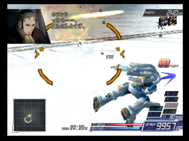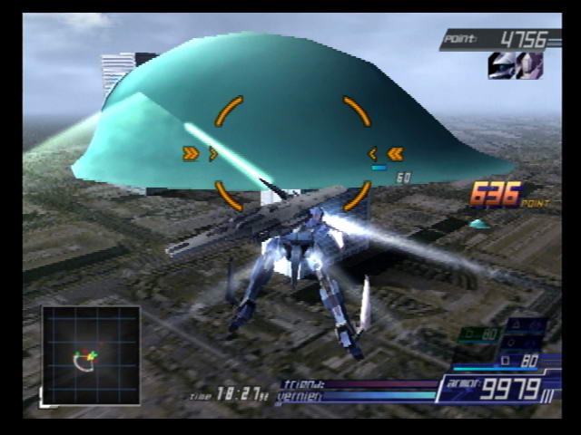 The new much-talked about feature in ACE3 is the inclusion of vocals in the soundtrack. Before launching into a mission, you can switch between vocal or instrumental versions of your chosen mech's BGM. This combined with the impressive opening songs of the game's line-up give ACE3 the best soundtrack in the series, and the feature was so popular they re-released ACE2 with vocal tracks, as mentioned earlier.