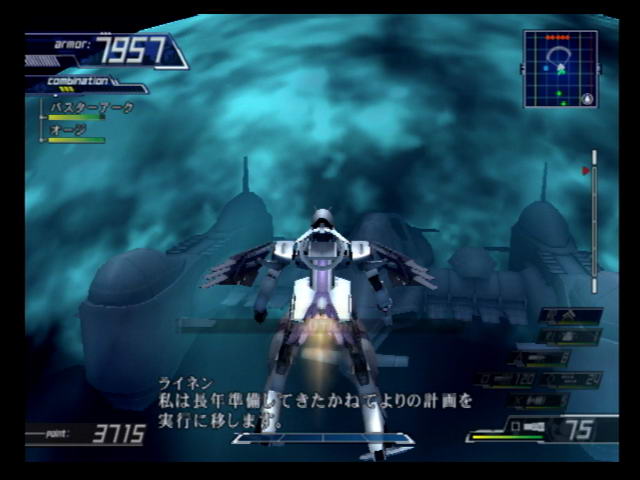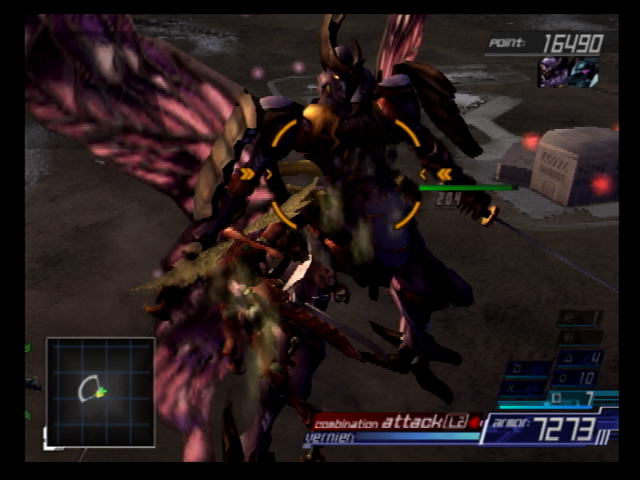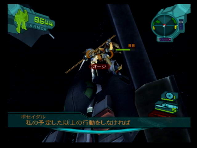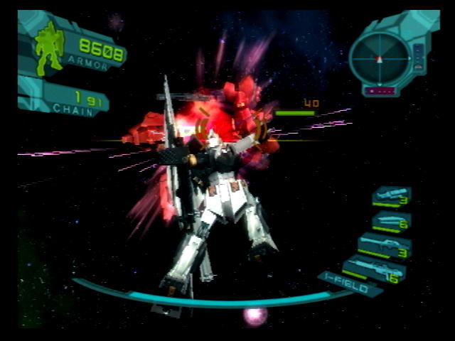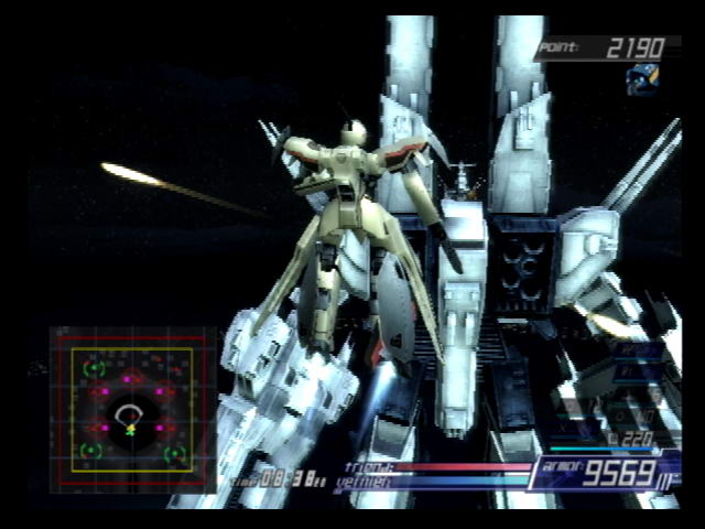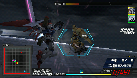 The mission structure departs from the series norm and takes after the PSP Gundam games. Each mission is generally divided into two or more areas separated by small portals at the edge of the map. Depending on the mission, your path through these areas is either linear or requires going back and forth between them. There's a set time limit to finish each mission, and running out of hit points returns you to the fray with a fraction of your health and one minute deducted from your remaining time. The damaging energy fields from ACE3 come back along with new jamming devices that block your radar until you destroy them.