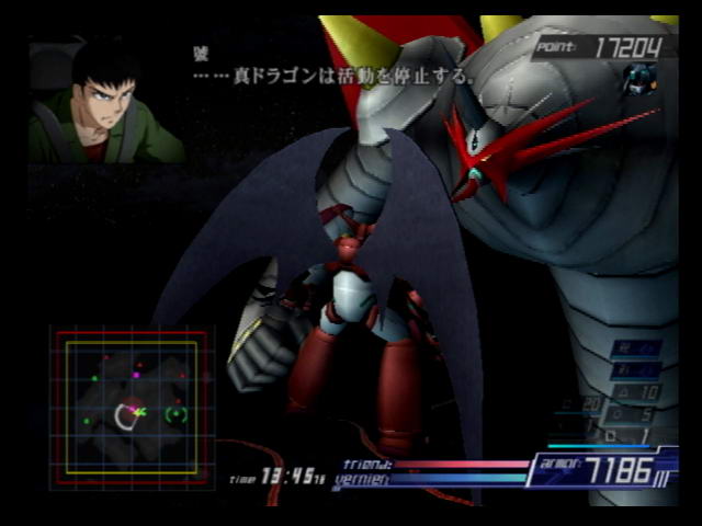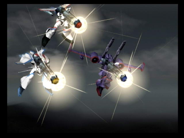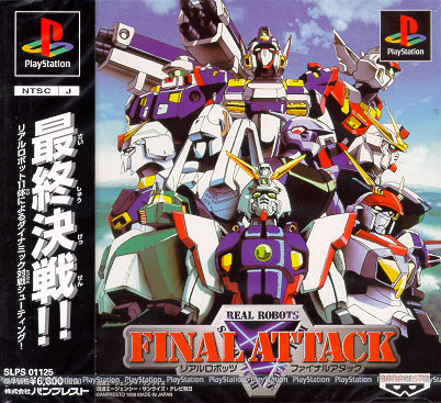 Back in the '90s, Banpresto tried to expand the crossover mecha license into other genres using in-house resources. The results were like silent farts. N64 owners got a clunky fighting game called Super Robot Spirits, while PSX owners got something akin to the ACE series' prototype: A 3D action game called Real Robots Final Attack. To be fair, RRFA is a very blatant Virtual-On clone whose only distinguishing feature is having different attacks depending on what d-pad direction is held instead of what action is being performed. There's also a multi-stock bar that can be filled up to allow access to super moves, as well as a separate button for melee attacks. By this time developers were starting to push the graphical limits of the Playstation with stuff like Gran Turismo and Metal Gear Solid, and by that standard, the graphics in this game are an ugly blocky mess, to say nothing of the pitiful collision detection. All but one of the anime series here appeared in ACE at one point or another, and Super Robot Wars fans get treated to the popular SRX team mechs as playable bosses.