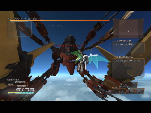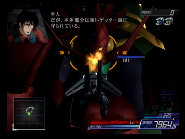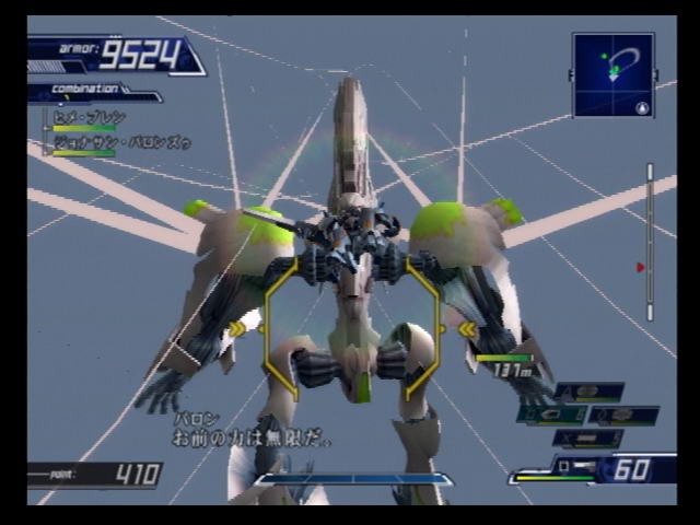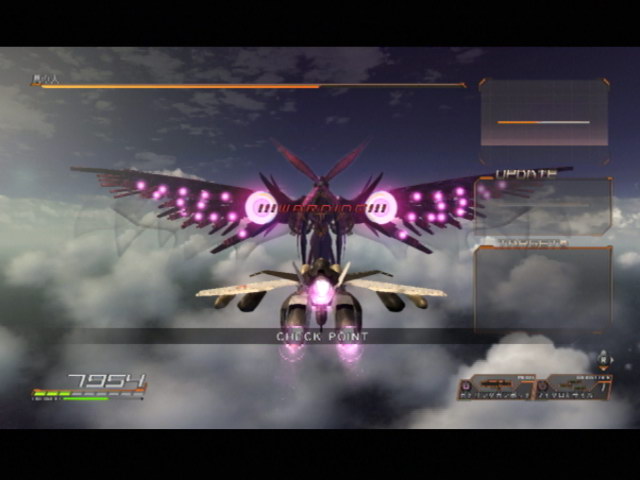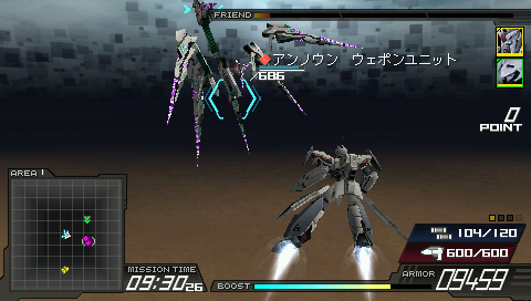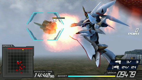 ACEP mixes elements from both the PS2 games and ACER. The old functional boost setup returns and gives you the ability to perform ACER-style boosting by holding the button instead of tapping it. Unfortunately, boosting here is very weak and has practically no tolerance for damage because an enemy can fire a shot completely perpendicular to your flight path that will not only hit you but stop you dead in your tracks as well. Valkyries can once again fly in battroid mode, and the craptastic rhythm-tapping for your main weapon is gone. The lack of buttons on the PSP relegates the transformation, targeting and weapon change functions to the directional pad, and necessitates the return of ACER's weapon panels.