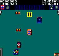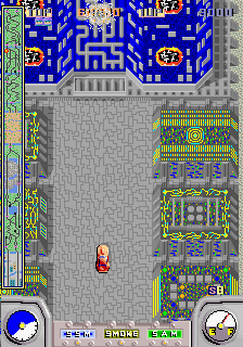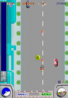 Spy Hunter gave you a rad car that could fire missiles and oil slicks, and it could even transform into a boat during water-based segments. Action Fighter goes one step further and allows you to control no less than five different vehicles in the course of a full game: A motorbike, a car, a dirt buggy, a helicopter, and a jet ski. This covers just about every stunt vehicle you can think of in your standard James Bond film and each one has their different feel. You'll mostly be sticking to the bike and car, both of which are similar and can be swapped at appropriate junctions. The bike's faster and has a smaller hitbox, but the car offers more firepower and controls easier. These vehicles follow the main road of the game's map, which starts out as a blank bar on the left side of the screen. However, driving through certain barricades unlocks new segments of the map, allowing you to see what's ahead and determine what junctions you need to take and indicating checkpoints with purple flashing lines. While it's not made too clear, your eventual goal of the game is to collect every map piece and special point ("M" and "S" icons respectively) by finding each barricade on the game's infinitely-looping road. This unlocks the enemy base (indicated by a red dot) whose core you simply shoot once to win. However, dogging you throughout your journey are lots of enemy cars and helicopters, not to mention the terrain itself which has a lot of curves, pits, rocks, and other obstacles for you to avoid. Furthermore, you have a fuel gauge which depletes if you drive too far without changing vehicles.