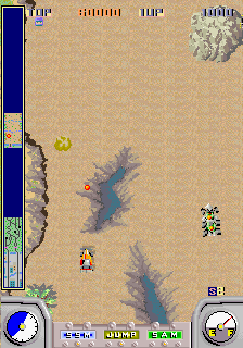 That being said, you can expect much pain in Action Fighter, which would be more enjoyable if it wasn't so face-squishingly brutal. Arcade games are quarter-eaters by nature, but AF hogs down your credits like a gas-guzzling 24-wheeler on diesel. The main problem is that if you go too fast, it can be tricky to dodge what's coming ahead. This is a greater hazard on some segments than others, particularly the desert buggy parts which are laden with obstacles and pitfalls. The natural response to this would be to slow down, right? Well, if you slow down too much, it makes it easier for enemies to hit you and you run a greater risk of not finishing your current segment with any remaining fuel. It's not uncommon to instantly lose another life merely a few seconds after respawning from your previous death. It can be an ordeal-and-a-half if you intend to reach the game's actual end, but even getting a high score is enough of a feat in itself.
