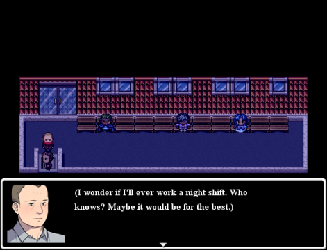 The game, even in its final form, is made crudely from RPG Maker, with the default portraits for unimportant NPCs used instead of new art. It does create an uncanny valley effect at times, but it’s clearly a choice based on budget. Very few tiles are custom made, and the well done CG art mixed in (from the talented Archia) doesn’t particularly match the game’s regular classic RPG style brought on by the engine used. But all these ugly contradictions seem to fit, if only because the story being told is about Winter’s (and O’Neill’s) ugly hypocrisy. Nothing about their story fits as it should, because they’re mentally poisoned, and the cheap production actually manages to compliment this in some way. It’s distracting at times, especially the generic menus, but you forget about it quickly as the story begins to move into that second day.