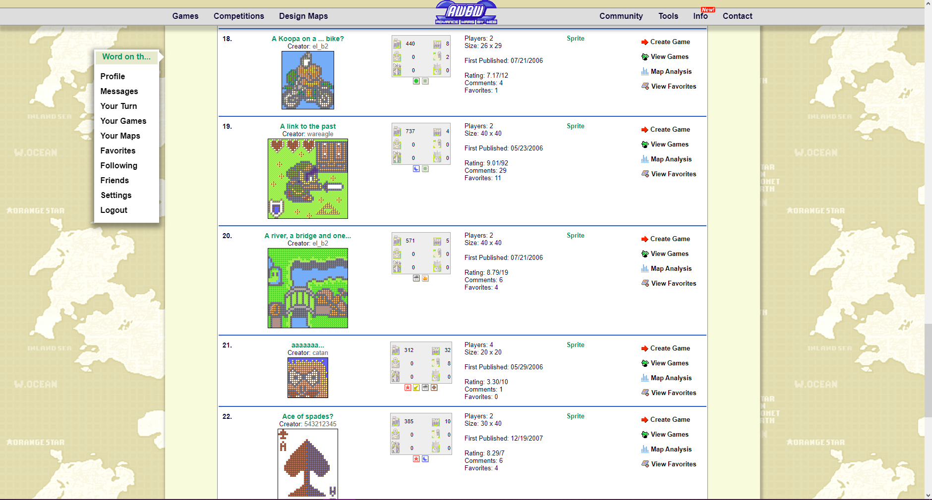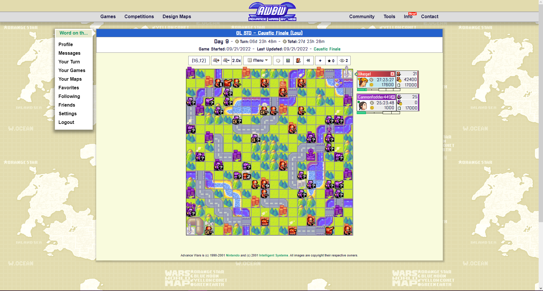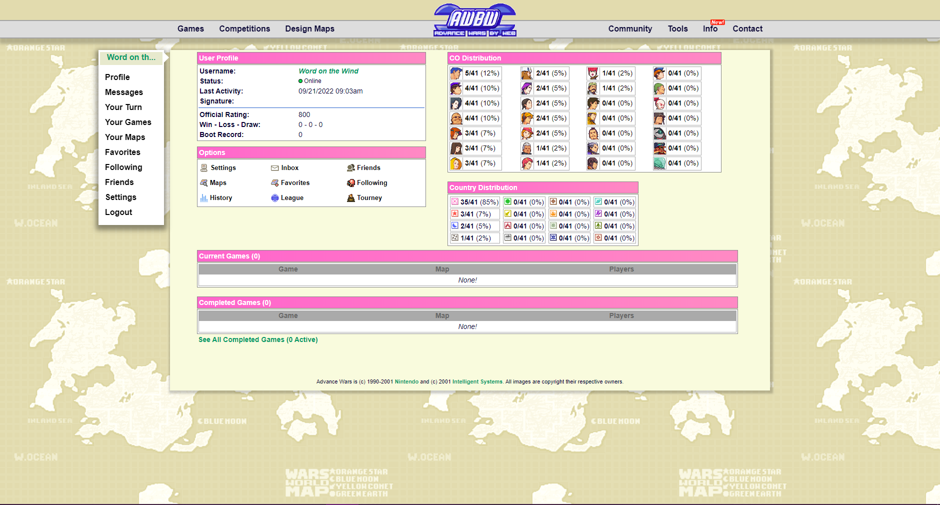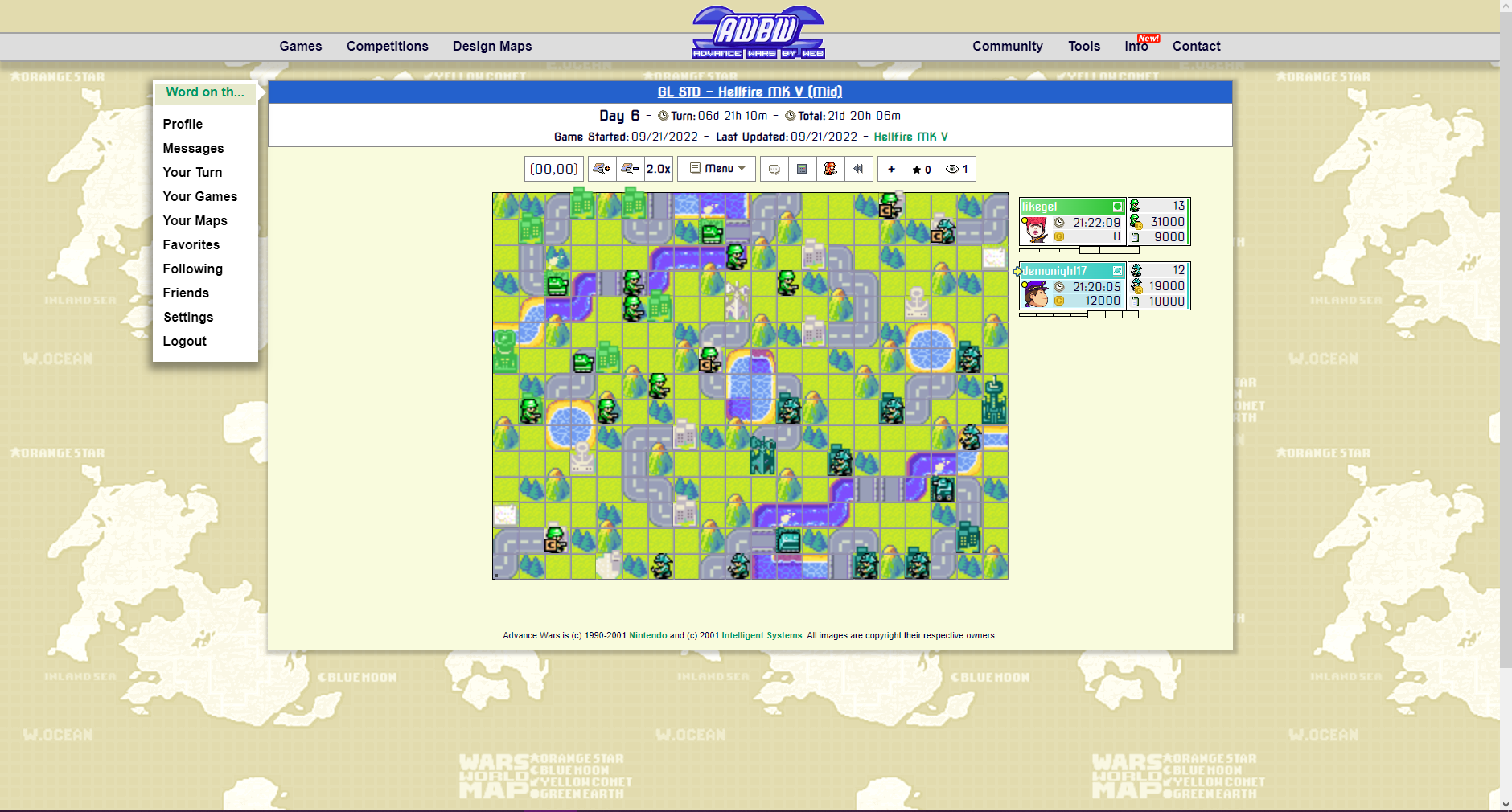 Years before Days of Ruin provided players a means to play Advance Wars over the internet, the desire to do so was in place quite early on. In 2004, prior to the release of even Dual Strike, the inclined reached reality when internet user amarriner coded what could be described as an email-chess version of Advance Wars, using Advance Wars 2 as the template. Over the years the site has received several updates, allowing for browser-based competitive gameplay among the community. This site was designated Advance Wars By Web, or AWBW for short.
