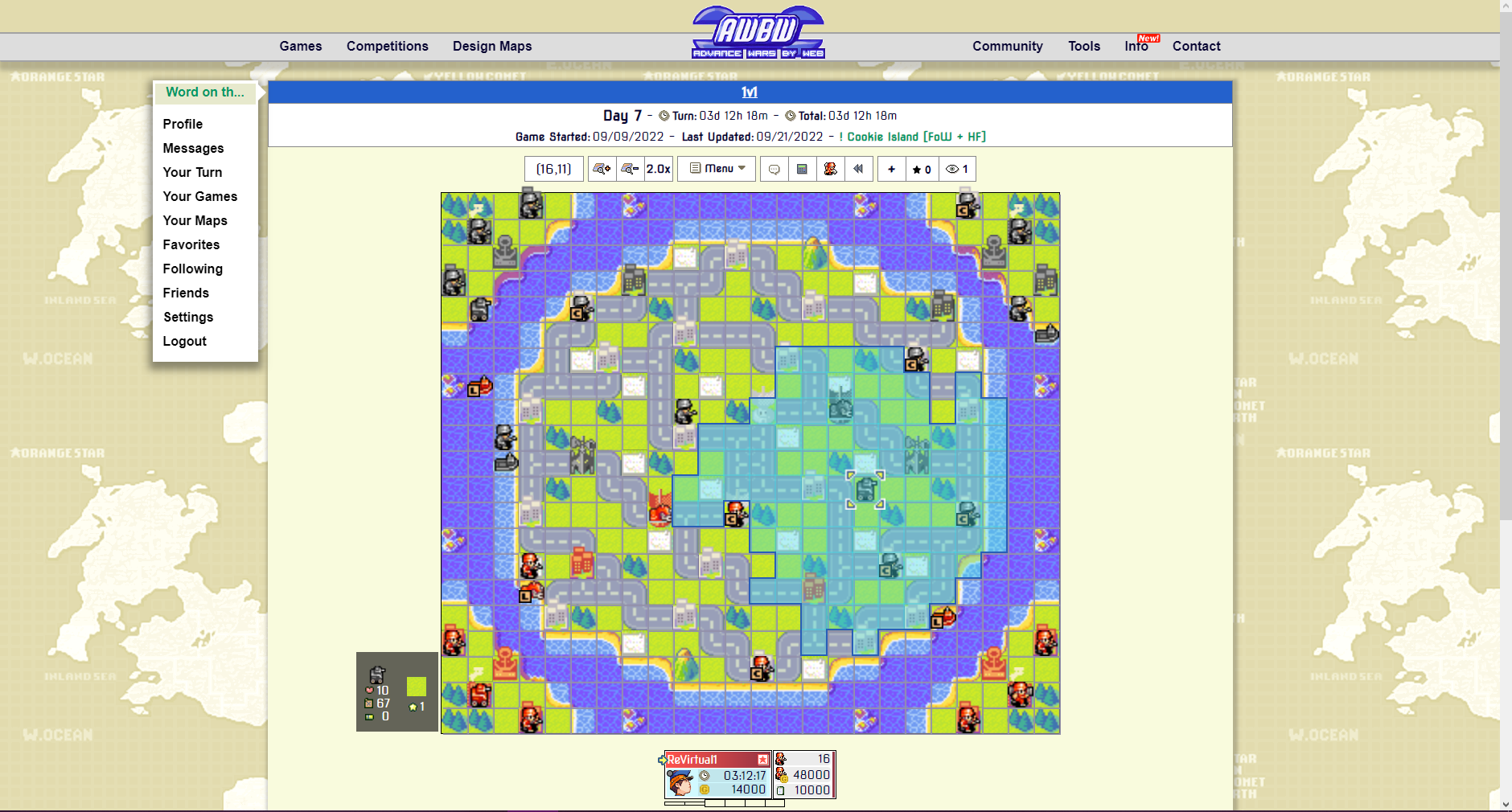 Finding a game to play is very easy, as there’s several avenues that a player can make use of. The community Discord server is set up with several functions to perform quick-match set-ups, and the site itself offers randomly generated public games that anyone can hop into. In addition to the aforementioned tournaments, AWBW features a ranked match-up system to assign players of roughly equivalent skill to a game using parameters to ensure a given kind of game such as Fog of War, or High Funds.