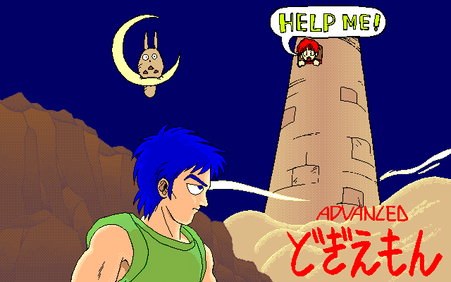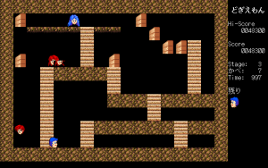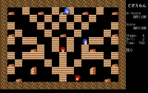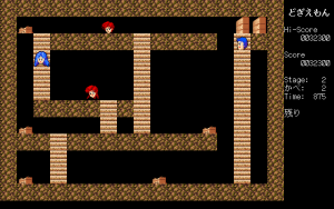 In nearly every Ys game, Adol gets kidnapped or imprisoned by someone, and it’s up to his partner Dogi to crush some walls and rescue him. Advanced Dogiemon, a doujin game by Circle Mitei finally gives Dogi the starring role in this single screen action-puzzle game. In each stage, you need to crush all of the walls, then touch Adol. At the same time, you need to avoid various enemies, including Feena and Lilia. It’s never explained what this story is – did Feena and Lilia kidnap Adol? Are you merely crushing walls to impress him? All of the characters are represented as heads, which looks extra silly.