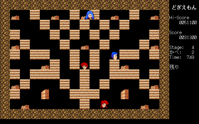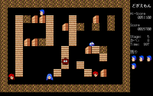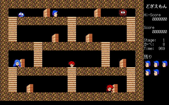 Dogi can crush walls that are one-and-a-half tiles away from him. The characters move in half-tile intervals, so you need to carefully position Dogi so he can properly smash some mid-air walls without falling. But like most of these Lode Runner-style puzzle games, there’s often a particular order in which you need to destroy them, or else you’ll end up in an unwinnable situation. In cases like these, you can hit the Escape key to sacrifice a life and restart the stage in its default configuration. You have limited lives, but you can also restart at any completed level. There’s also a stage editor so you can build your own puzzles.
