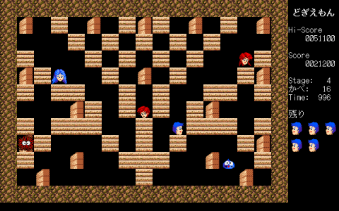 Dogi can crush walls that are one-and-a-half tiles away from him. The characters move in half-tile intervals, so you need to carefully position Dogi so he can properly smash some mid-air walls without falling. But like most of these Lode Runner-style puzzle games, there’s often a particular order in which you need to destroy them, or else you’ll end up in an unwinnable situation. In cases like these, you can hit the Escape key to sacrifice a life and restart the stage in its default configuration. You have limited lives, but you can also restart at any completed level. There’s also a stage editor so you can build your own puzzles.