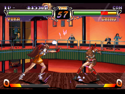 Takahiro Yonemura’s soundtrack features remixed themes from Advanced V.G. and some original works – it’s really good this time around. Most of the tracks are energetic enough for a fighting game, especially Ayako’s, Chiho’s and Yuka’s stage themes. He also made a PC-98 rendition of this album, despite the game never being released on that system, perhaps it’s a throwback to the naughty beginnings of the series. The voice actresses also did a better job portraying their respective characters, Yukana improved on Yuka’s voice in particular, as she now sounds more like a person of her age.