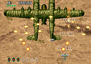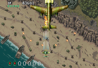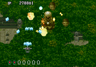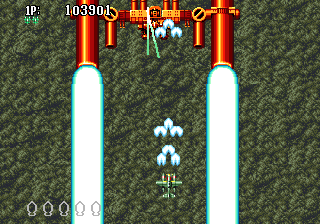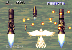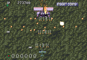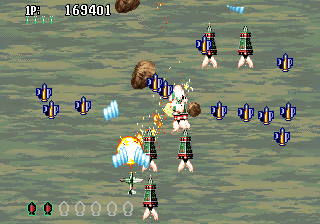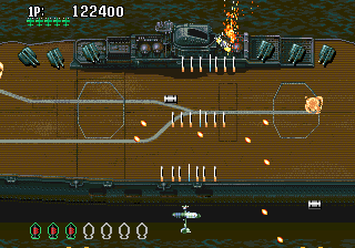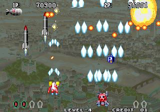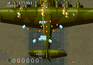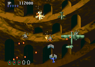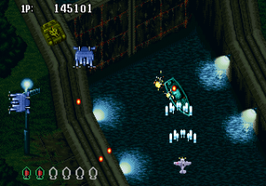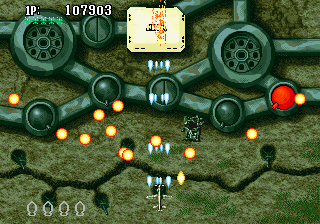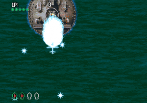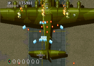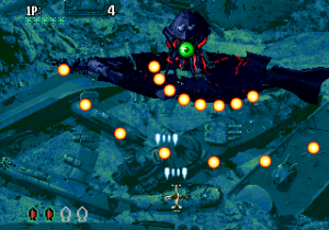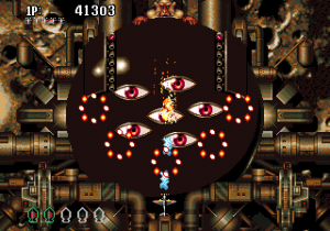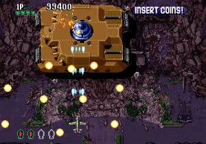 The way branching paths are handled has changed too. At the end of each level, a large enemy plane tries to escape through a portal. Which path you take depends on which wing you blow off of it first. One game lasts eight levels, but they all come from a large pool of over fifteen. You end up getting harder levels and tougher bosses if you’re doing well, likewise, if you end up with a bad score and use more than a few credits, the game pulls its punches and sends you to easy levels. This simple, but very well implemented rank system adds a lot to the already high replay value.