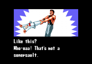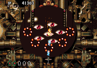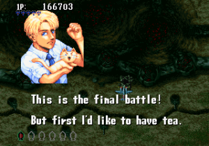 The Man is another hidden character, this one from Video System’s car game, Turbo Force. He is a mysterious person who pilots a really cool flying car called Diabloon, with powerful guns mounted to its hood. The Man is revealed to be Captain Waffle from another Video System game, Spinal Breakers. Diabloon is still a big red car, but is fitted with jet engines so it can fly. Unsurprisingly, it plays a lot like how it does in Turbo Force. Diabloon’s main weapon is a spread-fire plasma gun, and its bomb attack rains meteors all over the screen or puts up an invincibility shield. Which bomb comes up is decided at random.