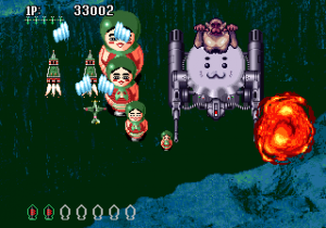Kotomi is a hidden character hailing from Video System’s earlier game, Rabio Lepus (also known as Rabbit Punch). Her main weapon never gets very powerful, but her bomb attack makes her invincible for several seconds, allowing you to just fly through things to destroy them. Unlocking this character requires PRECISE timing on the character select screen.