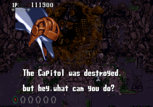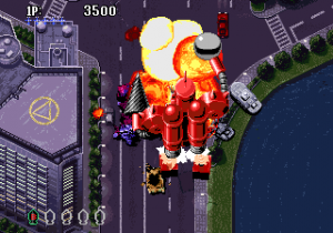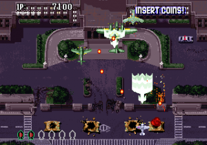 Lastly, Aero Fighters 3 makes an unexpected jab at Taito’s Darius series, parodying its pre-boss warning message and making you fight the stupidest battle in the series, a giant mahjong tile dressed as a school girl that skips and prances when attacking and cries when it gets hit. If she kills you, you get a special game over screen where she prances and sings as the world burns. It is by far the funniest moment in the series and perfectly illustrates the wackiness that lies beneath Aero Fighters‘ seemingly generic exterior.