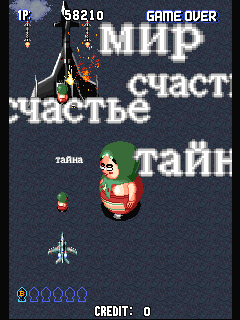 Chaika and Pooshika play very different from Aero Fighters 3. Their normal shot is a standard spread fire, while their charge shot launches explosive Russian dolls. Their bomb still involves giant Russian dolls smashing everything in their path, except the bomb sometimes summons only one giant doll. The giant doll shouts things in Russian and uses the words to destroy everything. It is much more powerful than the normal bomb.