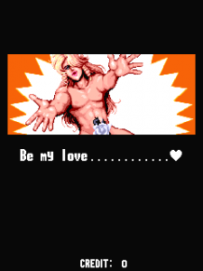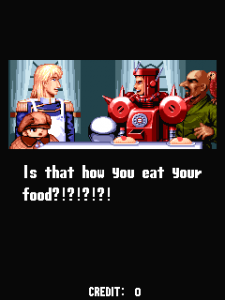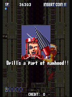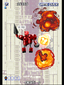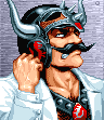 Mecha Keaton, looking somewhat closer to his appearance in Aero Fighters 3, acts almost the same way as in AF2 – except that his new bomber attack has him exit from his plane, grow to massive size, and stomp through the stages like Godzilla for a limited time. If you press ‘fire’ in this state, he will fire two giant particle beams, which destroy nearly everything in their path while recoiling him to the bottom of the screen. When time runs out, he shrinks back to normal size and jumps back into his plane. Keaton is alternately referred to as Robo Keaton, depending on which region of the game you’re playing. His unlockable plane, The F4-U plays just like it does in Aero Fighters 3.